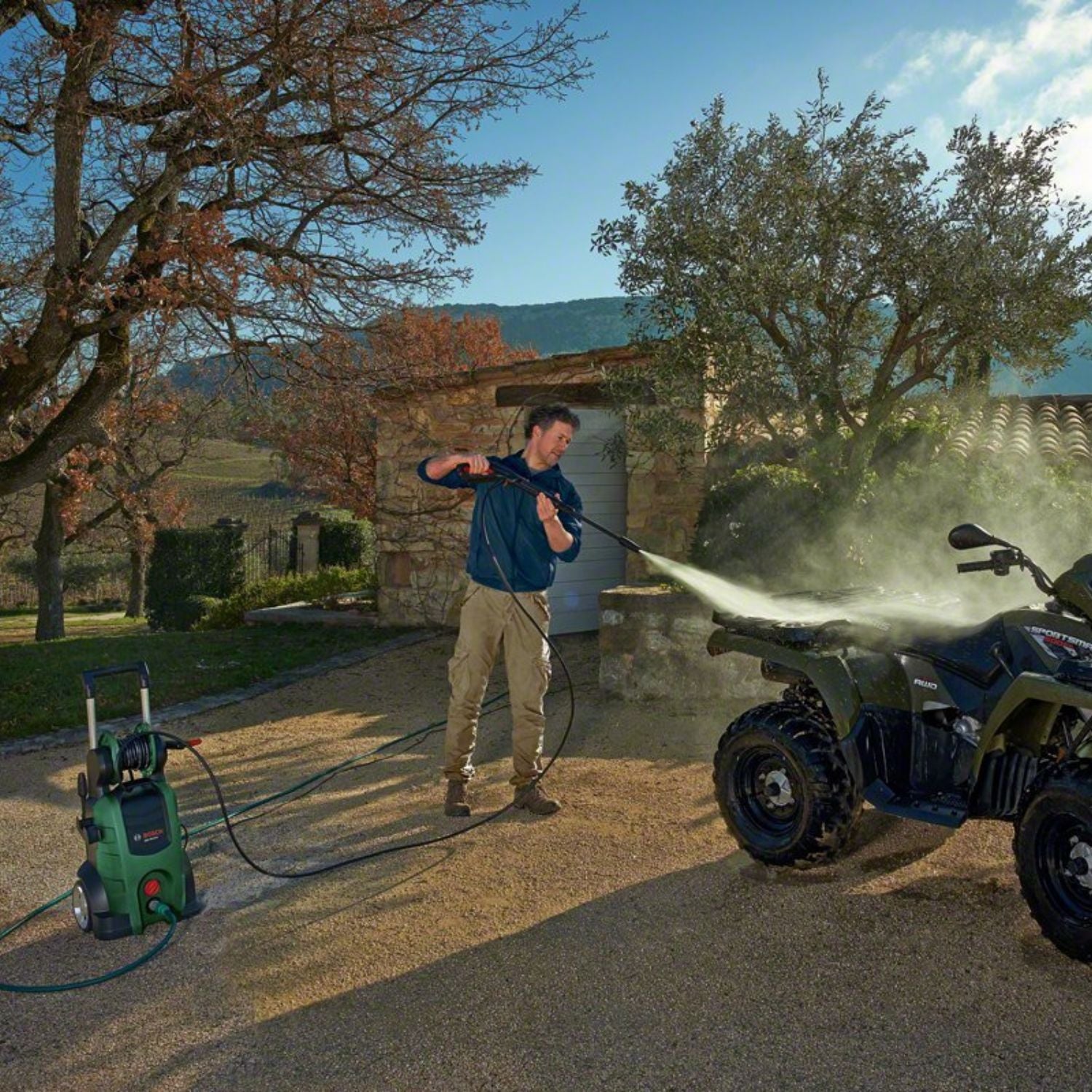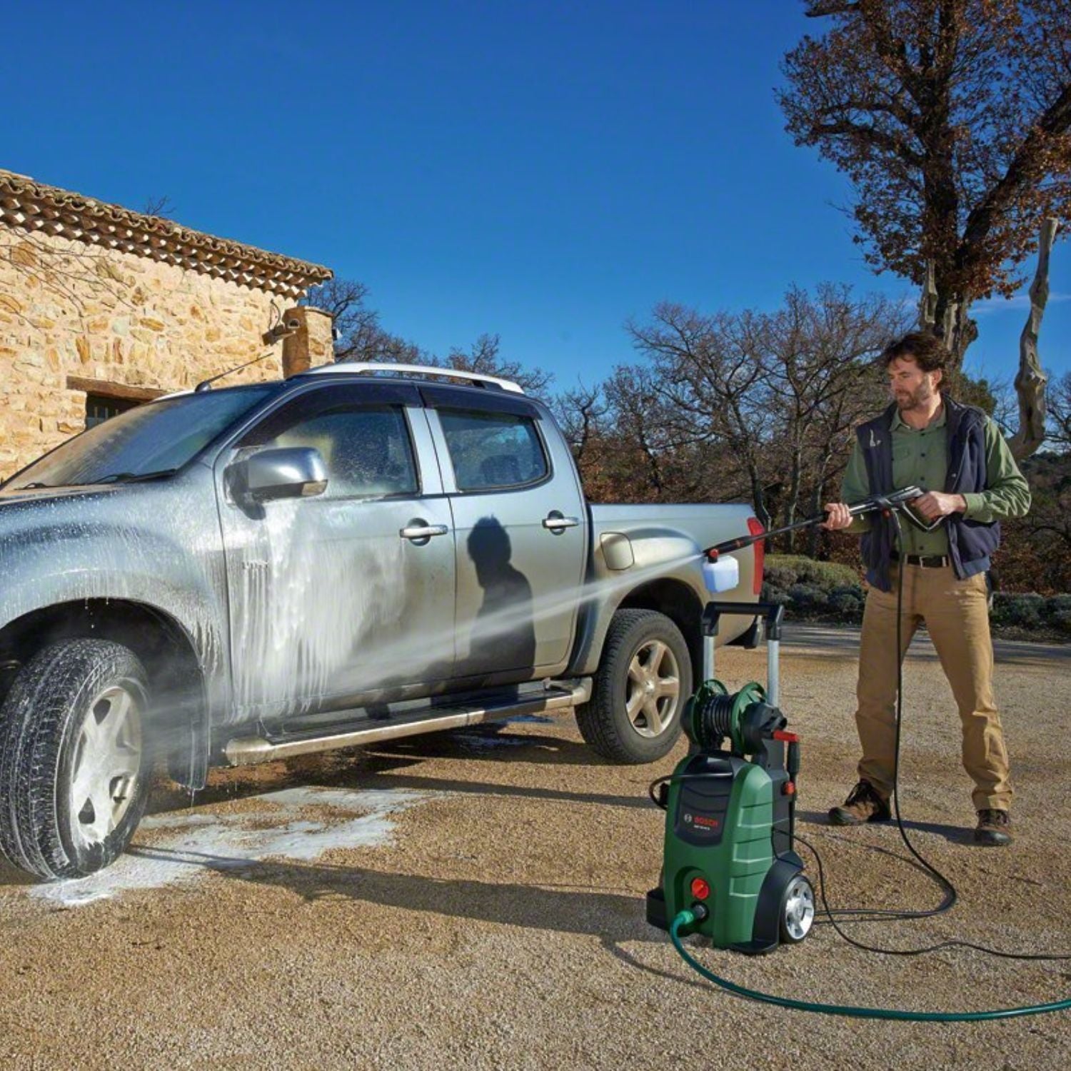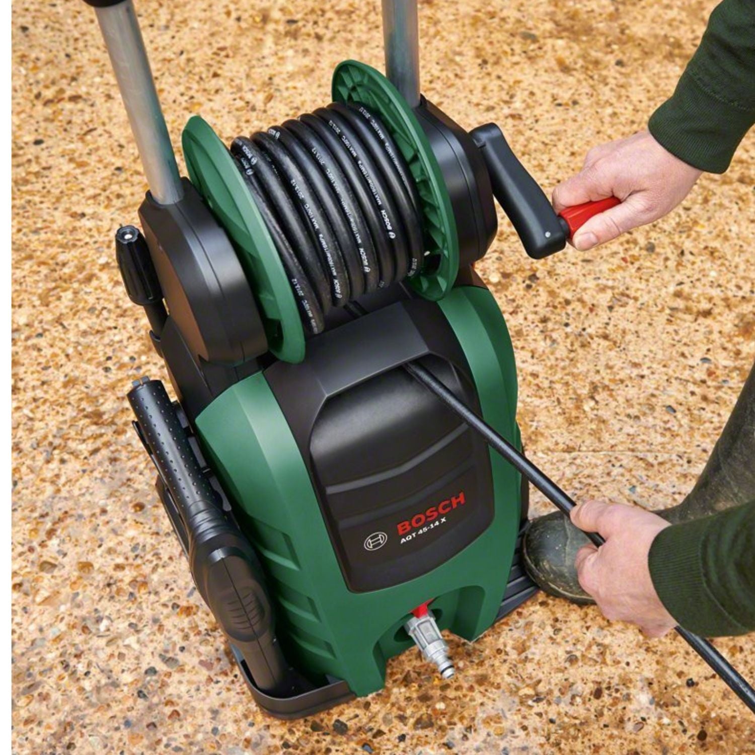 Bosch AQT 45-14 X Electric Pressure Washer. Equipped with a 2100W motor and delivering up to 140 bar high pressure, this washer is designed for deep and effective cleaning of cars, bikes, patios, driveways, garden furniture, and outdoor areas.