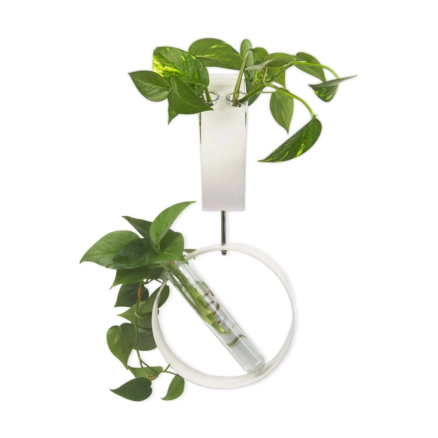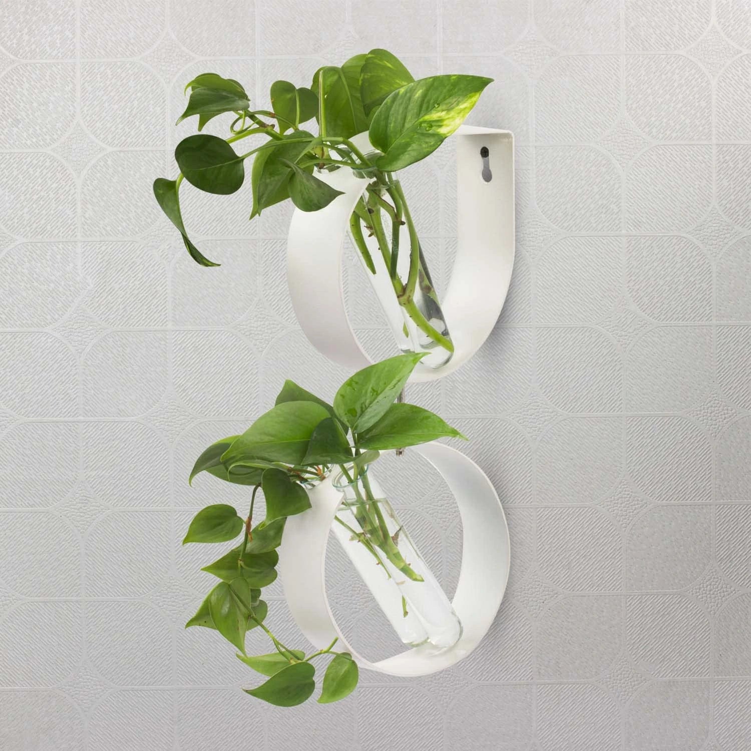 iCraft Wall-Mounted Planter Set. Designed with two sturdy metal rings and four glass test tubes, this stylish wall décor piece is perfect for displaying fresh flowers, hydroponic plants, or decorative stems.