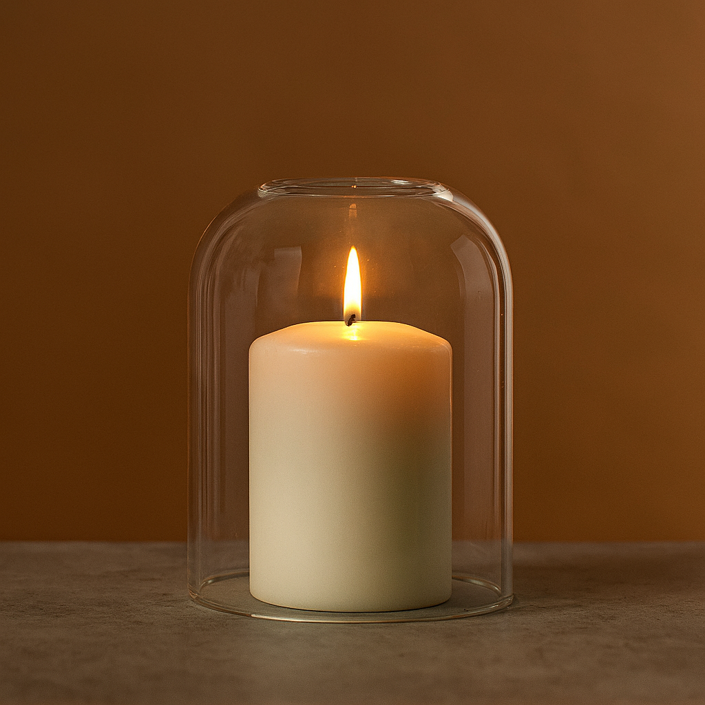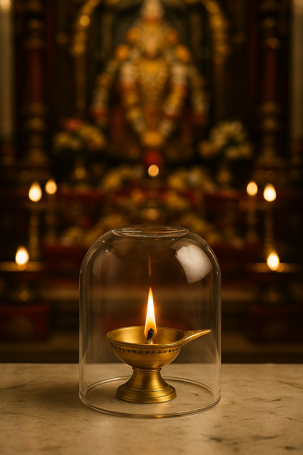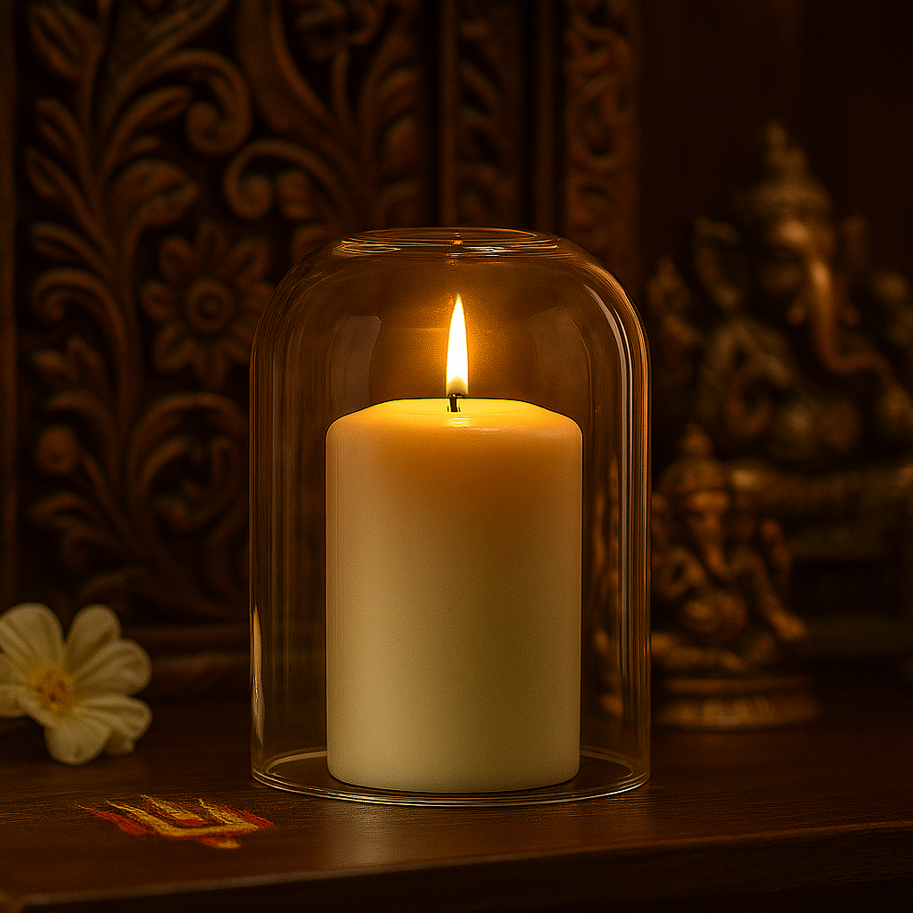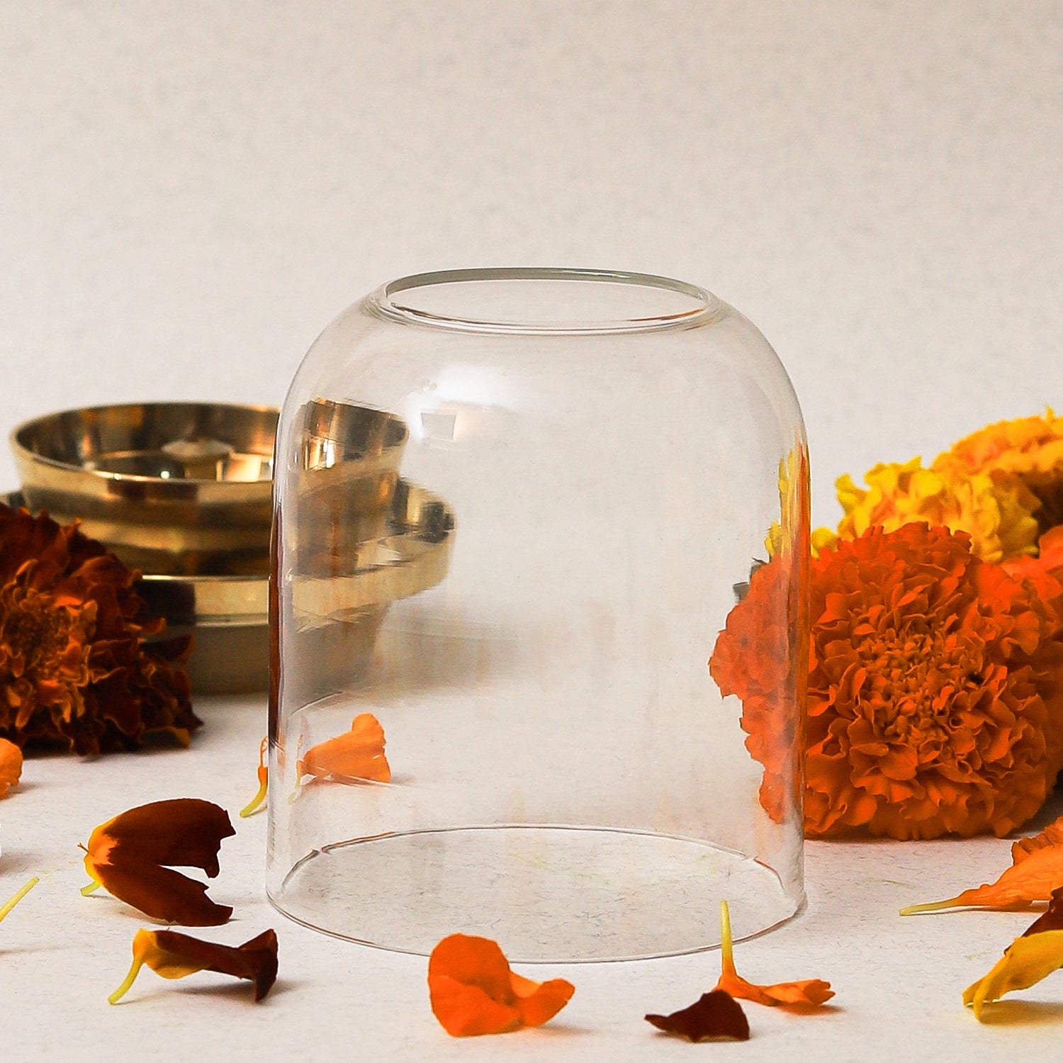 Klassic Curved Borosilicate Glass Diya Shade. Designed with a smooth curved shape, this diya shade doubles as a stylish tealight holder, perfect for creating a warm and serene ambiance during pooja, meditation, or festive celebrations.