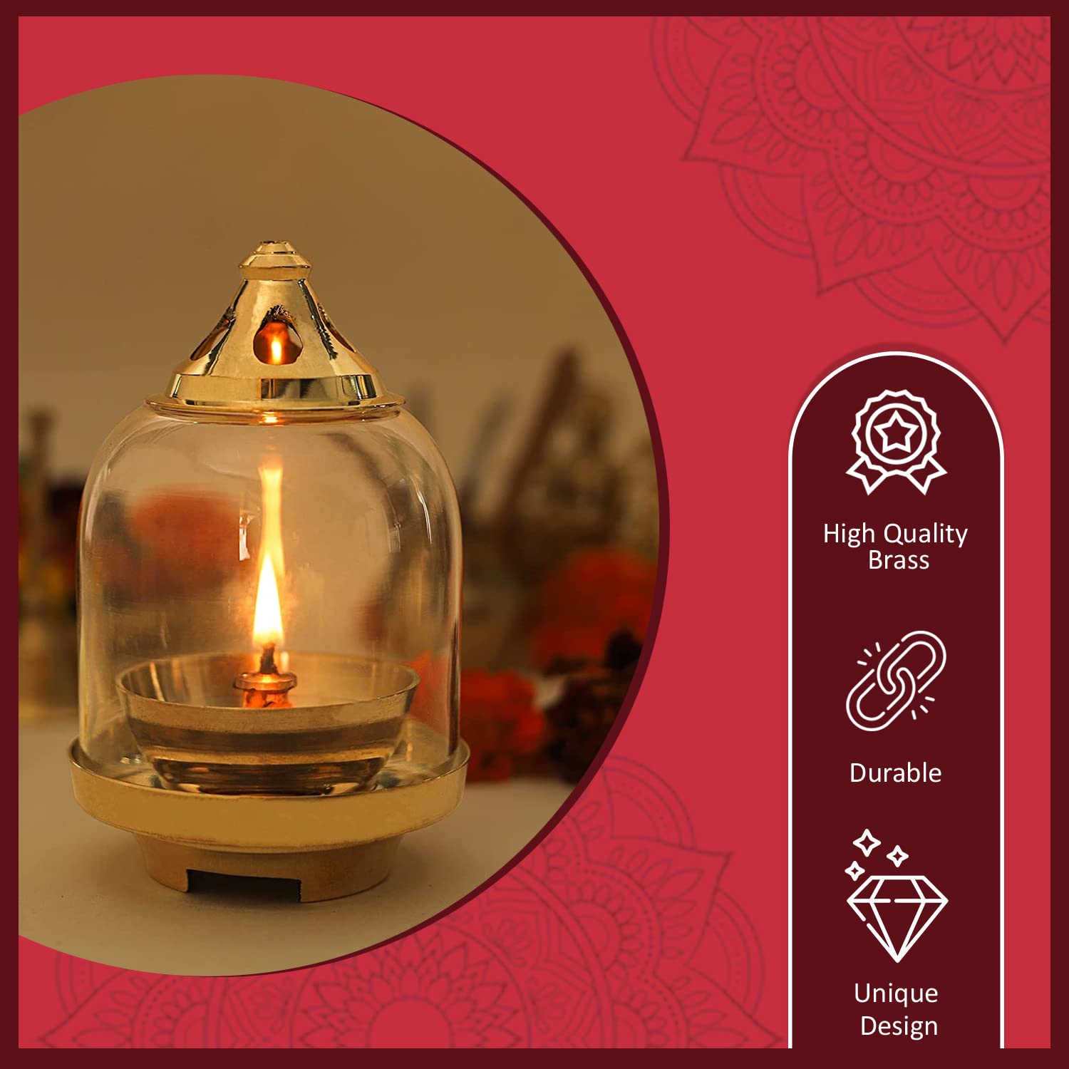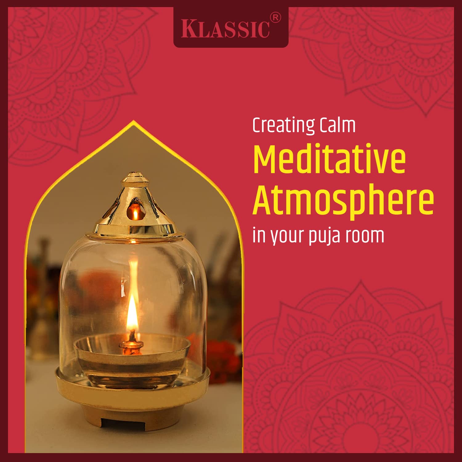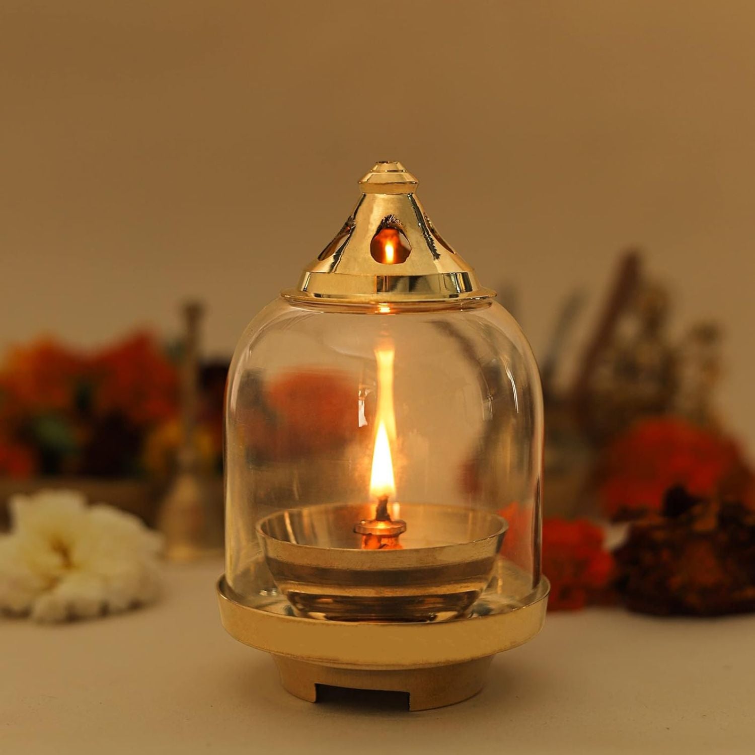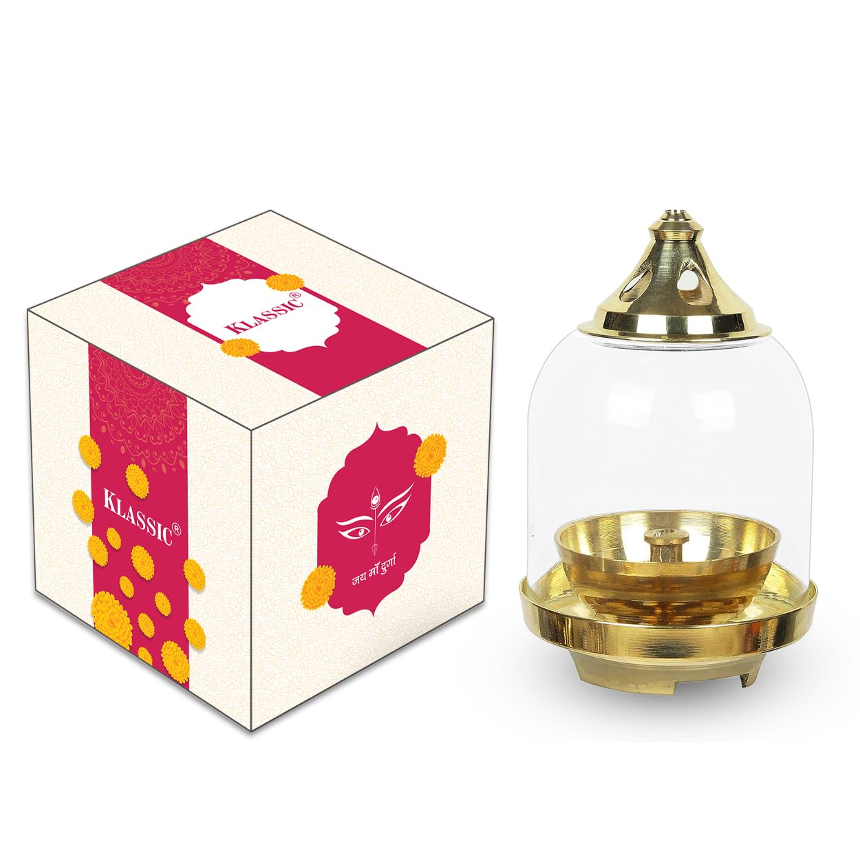 Klassic Prabha Akhand Diya, crafted from premium-quality brass with an elegant curved design. It features a borosilicate glass shade and a gold lid that protects the flame while keeping it glowing for long hours.