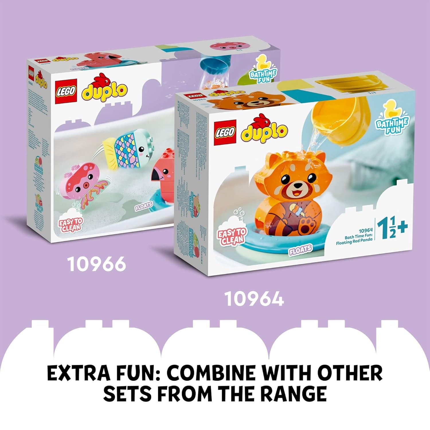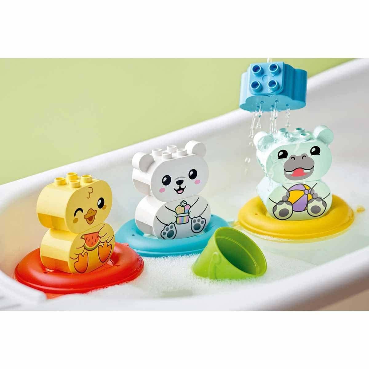 LEGO DUPLO My First Bath Time Fun: Floating Animal Train (10965). Designed especially for toddlers, this colorful set features a floating train of 3 buildable animals—a friendly hippo, duck, and polar bear—each in a floating ring that easily connects to form a train.
