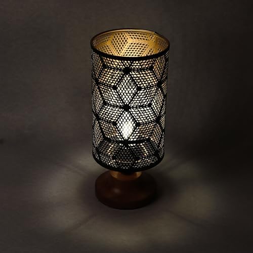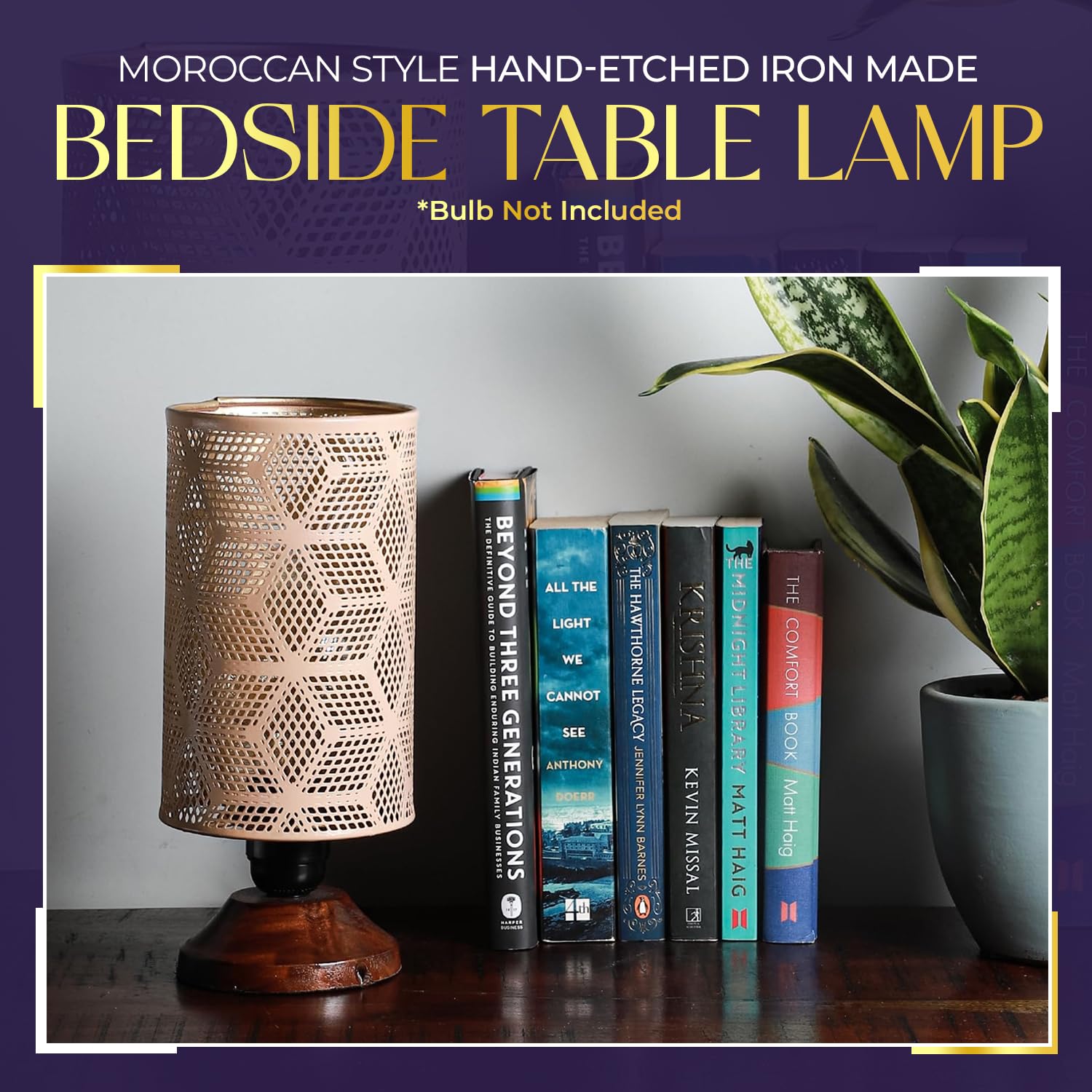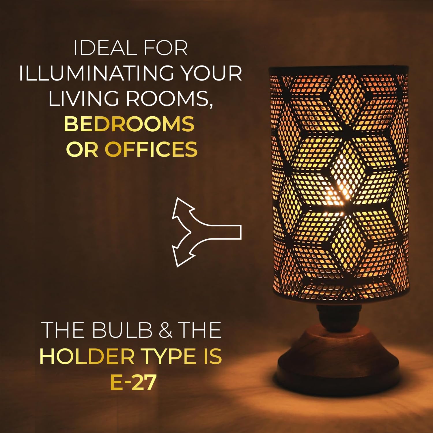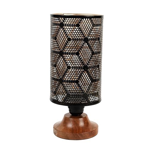 Lexton Moroccan Style Hand-Etched Iron Made Bedside Table lamp | Black Metal Round Frame, E27 Bulb Holder, Wooden Stand, Corded | Suitable for Home Decoration Office (Pack of 1, Bulb Not Included)