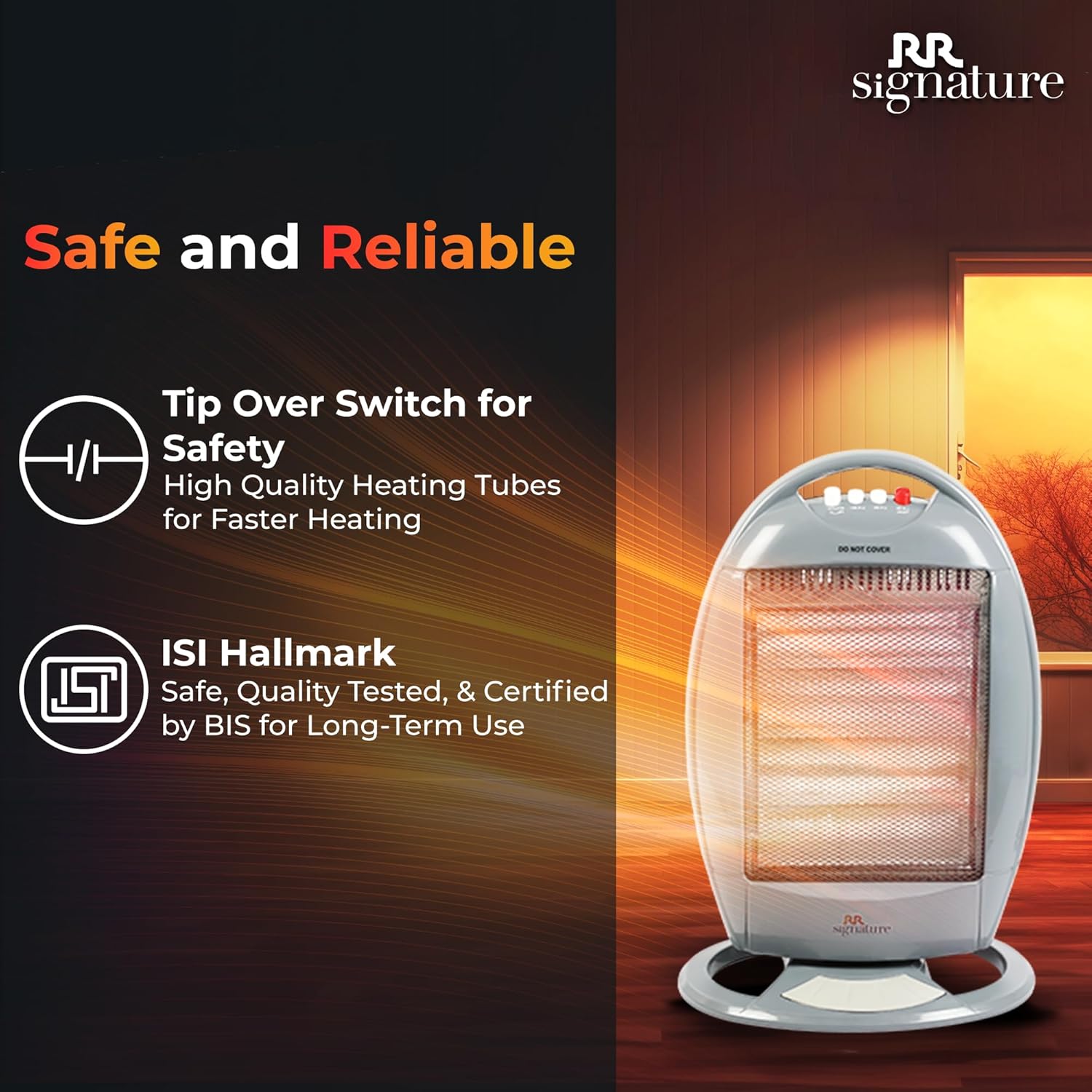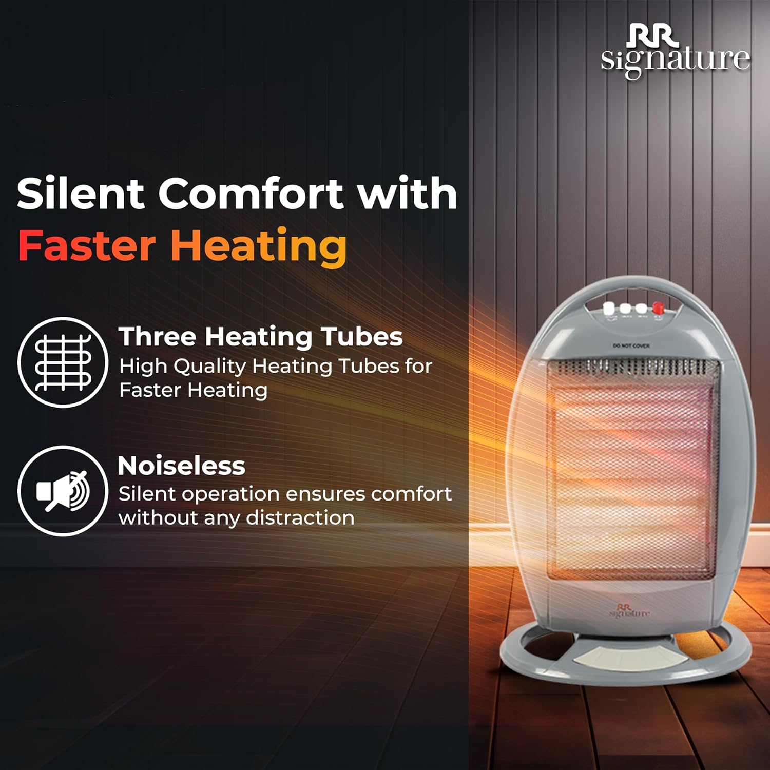 RR Signature HL-315 Halogen Room Heater 1200W, featuring 3 powerful halogen rods and 180° oscillation for uniform heat distribution.