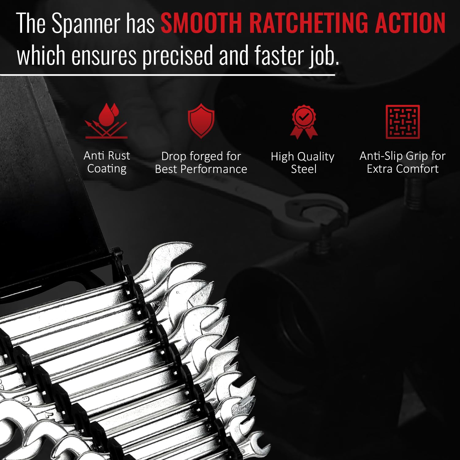 - The spanner set has smooth ratcheting action which ensures precised and faster job.